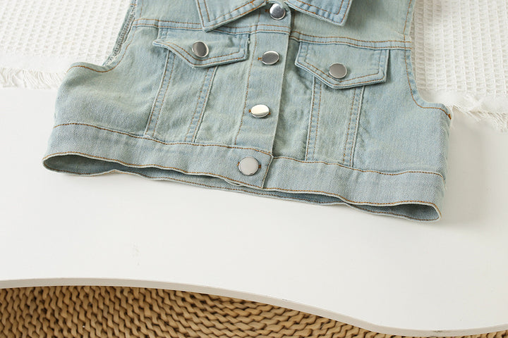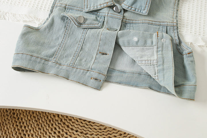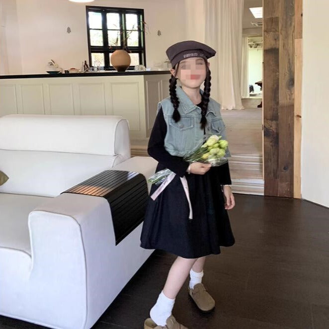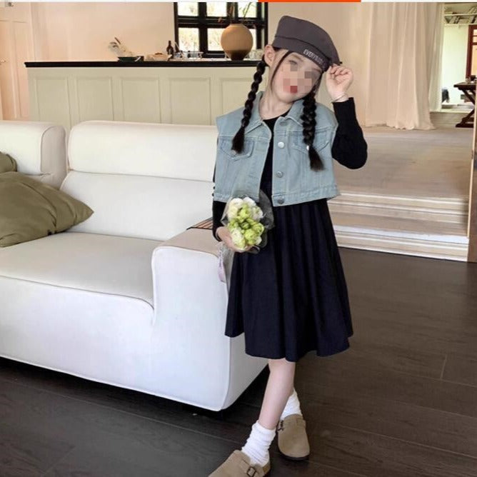 Denim vest jacket + long sleeved 2 pcs dress girls