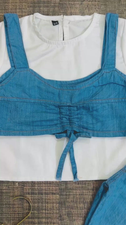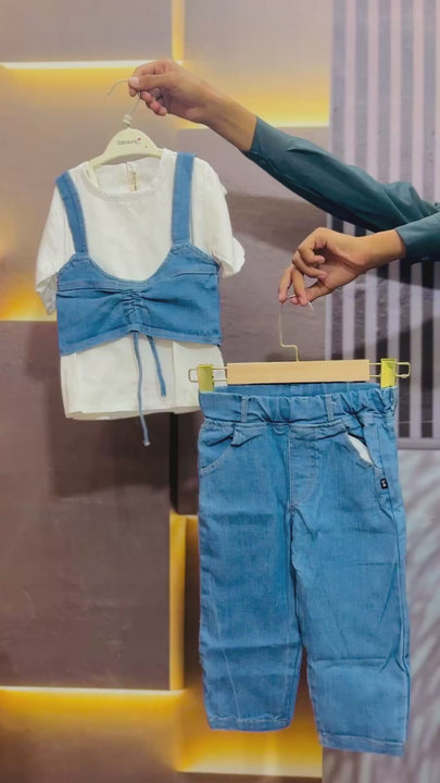 Cotton shirt + denim suspenders with adjustable and soft jeans pant 3 pcs dress girls