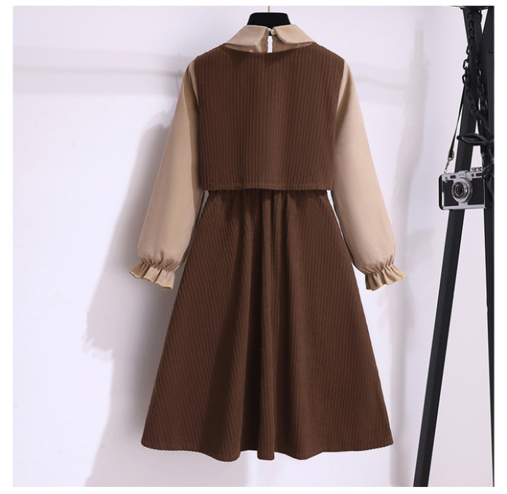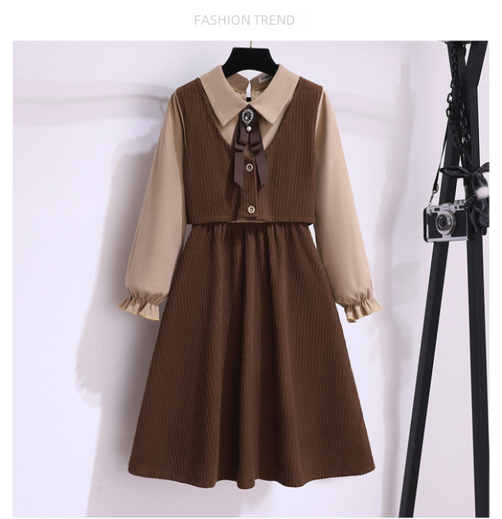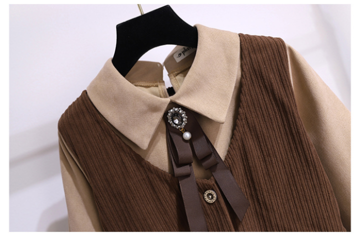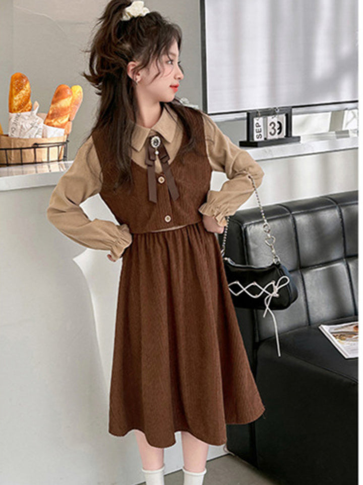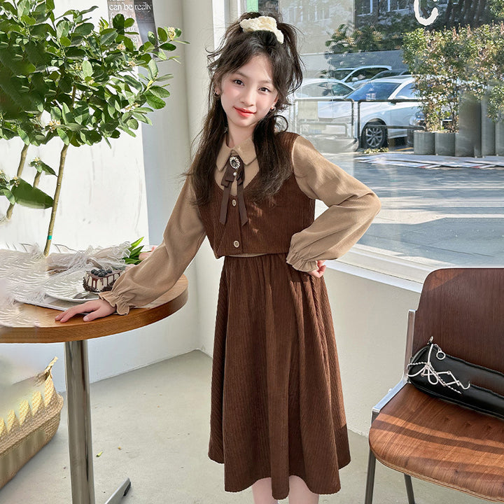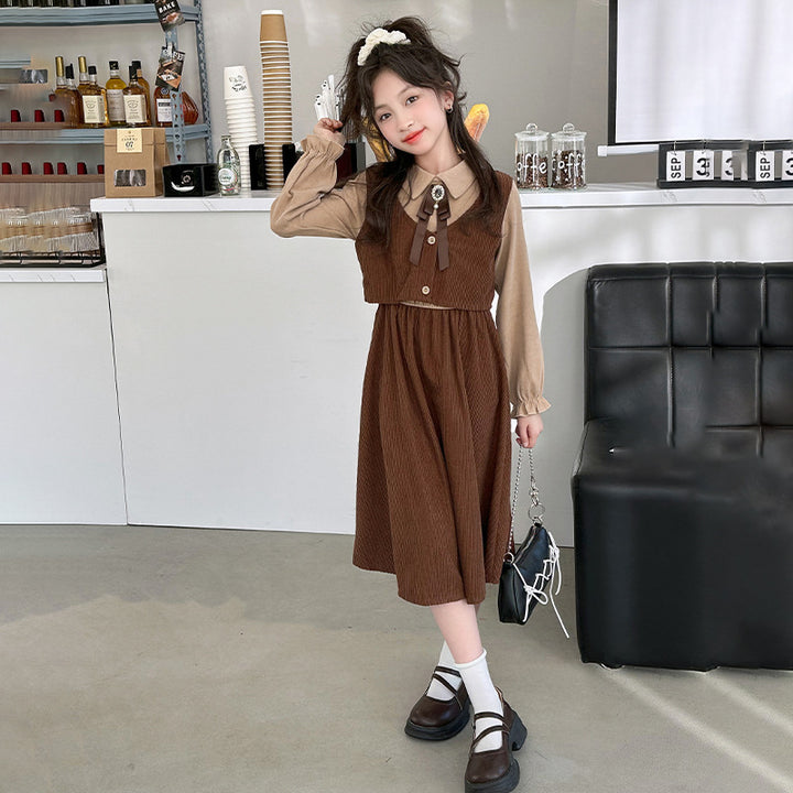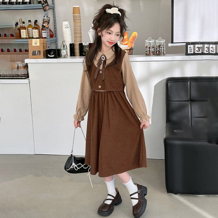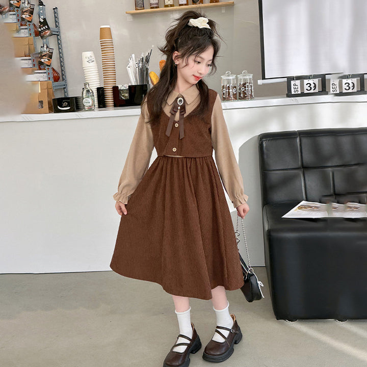 4457 Girls clothing new lapel fake two piece long sleeve shirt frock for girls